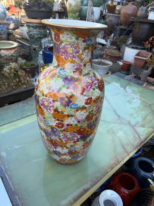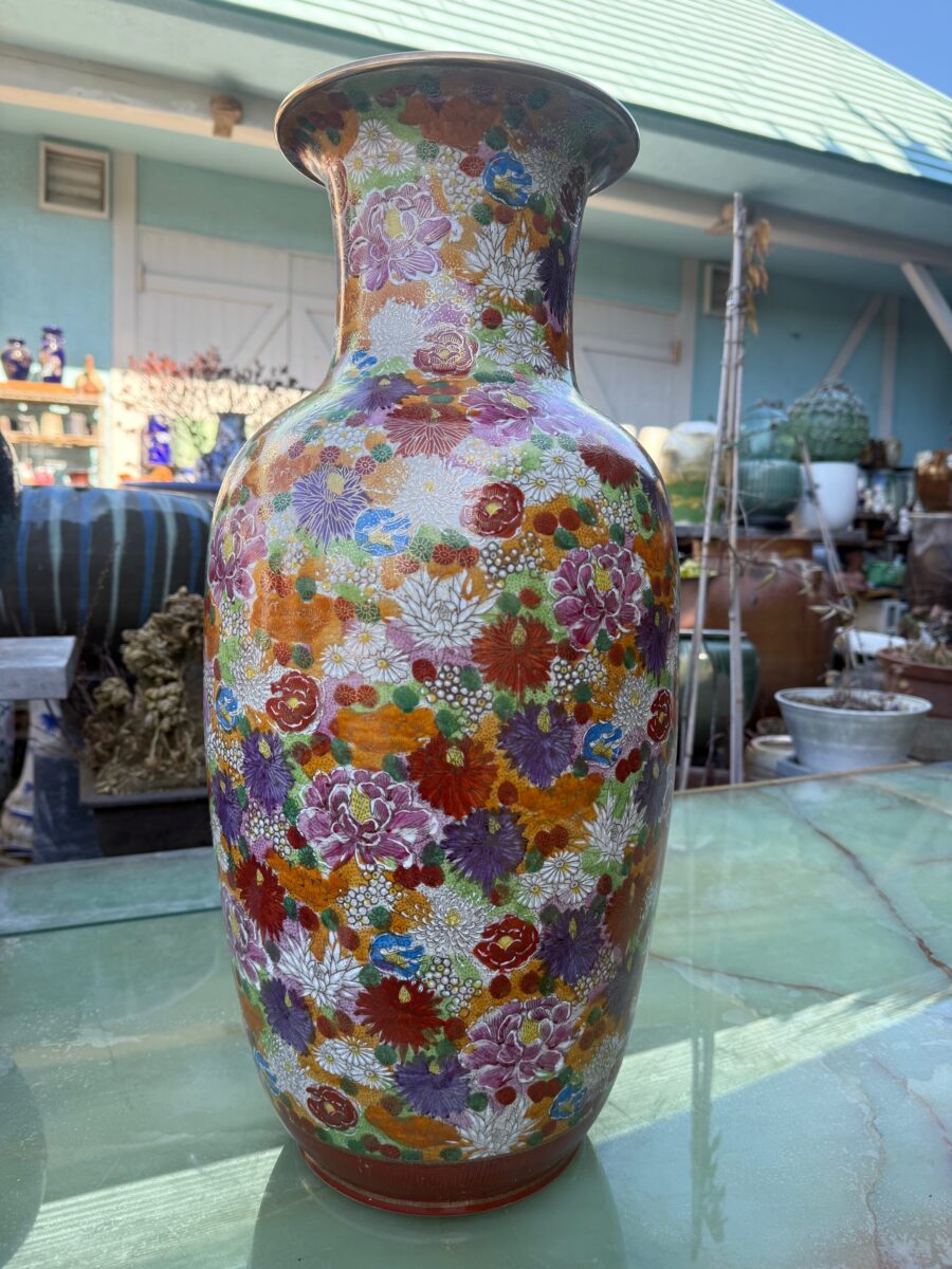 さつま金花詰 カテゴリー:オブジェ | その他 | 壷 タグ:花 | 薩摩 投稿日:2026年2月10日 高さ約1mの大変綺麗な薩摩焼の花瓶です。底に薩摩焼の窯印がございます。花を生けなくとも、花瓶を置けば華やかさがございますので飾り花瓶で楽しめます。