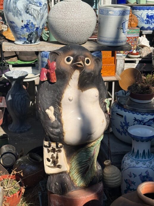 信楽焼きの大きな狸です。高さは1m20cm位のメスの狸です。この他にも狸はありますのでお好きな方のご来店お待ちしております。