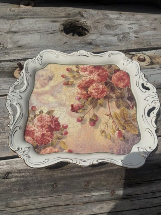 仏・リモージュ飾り皿 カテゴリー:オブジェ | その他 | 洋食器 タグ:フランス | 花 | 角皿 | 飾り皿 投稿日:2026年4月7日 天使と薔薇の図柄のおしゃれな飾り皿です。25cm角位のフランスの趣ある皿です。